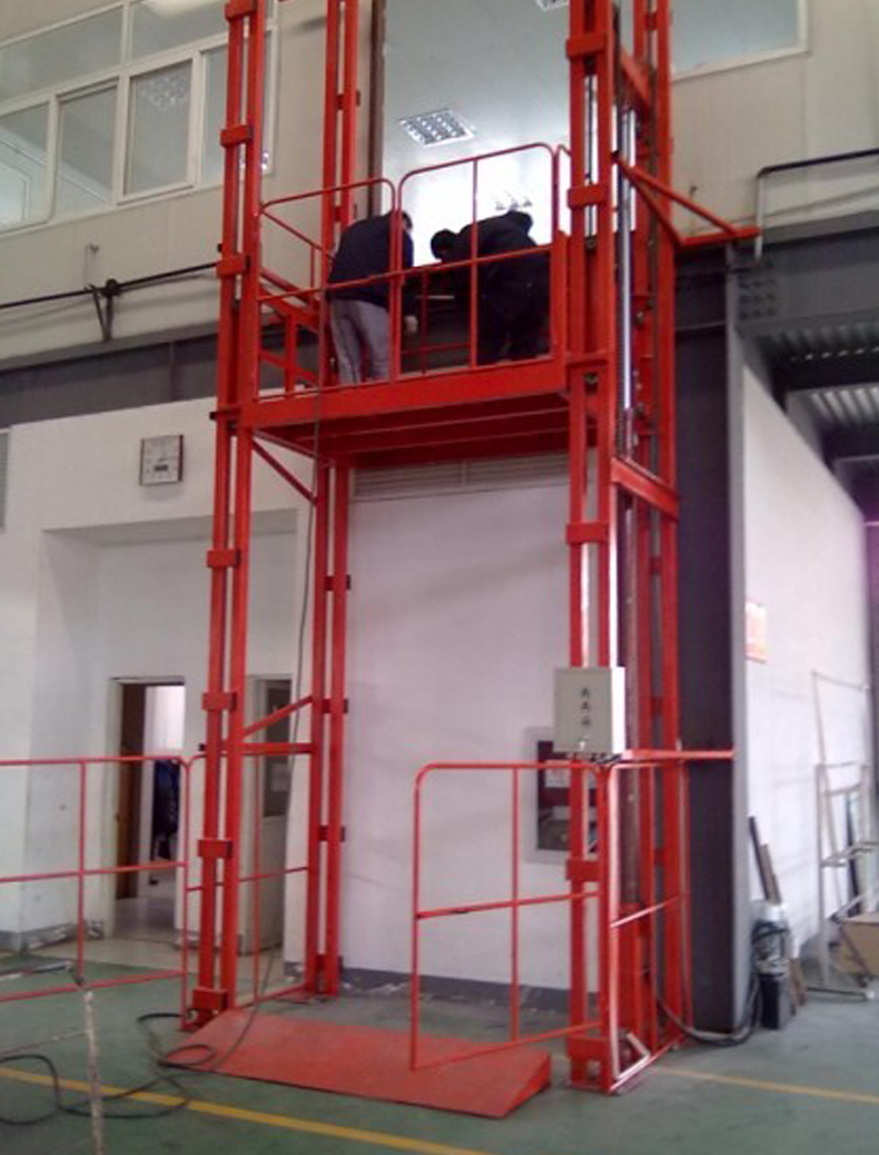 客戶選中的是醒目的桔紅色,額定載荷為1噸,臺面尺寸0.9*0.8米,凈升高度為3米。臺面上做了兩側(cè)護欄,進出貨口兩側(cè)各做一套護欄門。