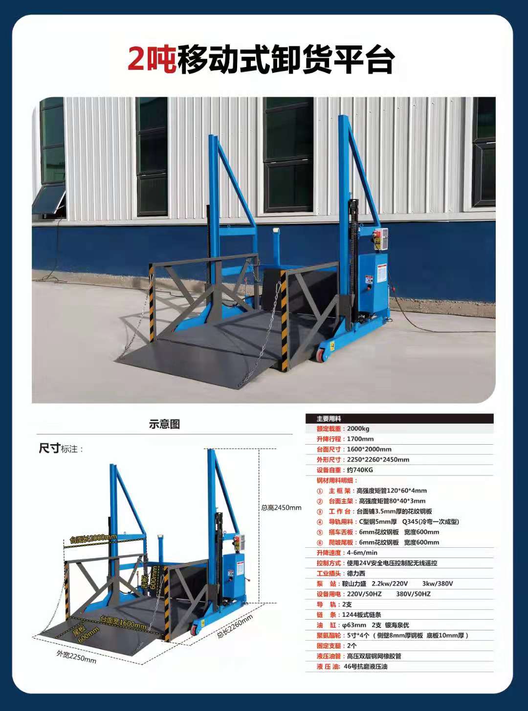 移動(dòng)裝卸平臺(tái)常規(guī)可以分為2噸和3噸兩種規(guī)格,升降范圍在1.7米以?xún)?nèi),適用于大多數(shù)常規(guī)集裝箱車(chē)輛的高度。適用場(chǎng)所:倉(cāng)庫(kù)、車(chē)站、碼頭、儲(chǔ)物流基地等行業(yè)。可單人操作,不占用空間,移動(dòng)靈活方便,大大提高裝卸作業(yè)效率。